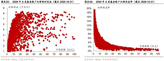 A类公募基金账户在规模披露上相对透明,对于收益率的计算更加准确。我们基于上述模型,针对A类基金账户计算对应的打新收益以及打新策略增强的收益百分比;为降低数据噪音,我们剔除了平滑规模在在1亿元以下以及打新绝对收益在1000万元以下的账户。从整体来看,基金规模对于打新收益的影响较为明显,其分布情况如下图所示。