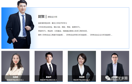 微淼商学院在各路宣传推广对封贺如此介绍:复旦大学经济系毕业的农二代、国家理财规划师,10年投资实战经验。