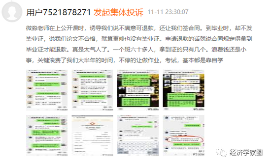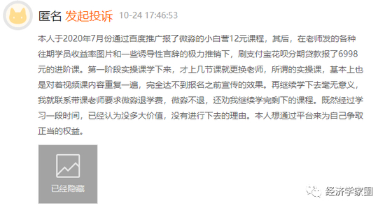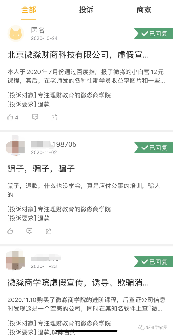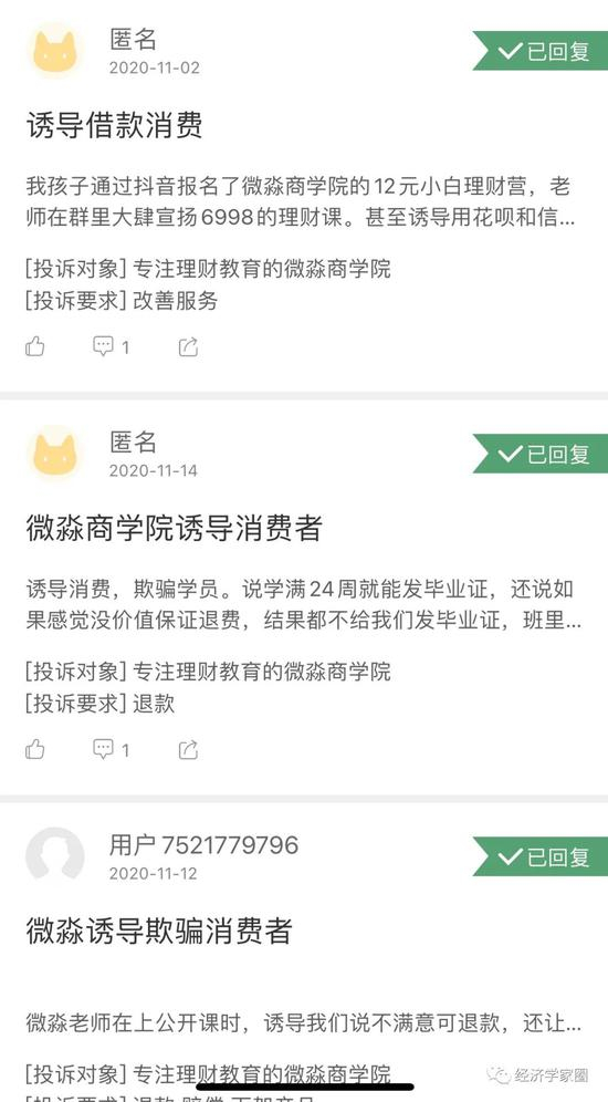 他们醒悟后发现申请退费比登天还难,于是黑猫投诉平台上“违规荐股、退费困难”“诱导学员利用贷款分期付费”“虚假宣传”的投诉有170多条,微淼商学院并未给过正面回应。