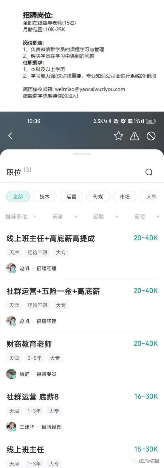 但,在一份天津的招聘启事上,财商教育老师、线上班主任和社群运营等,薪资可以给到20-40K,大专学历,经验不限。