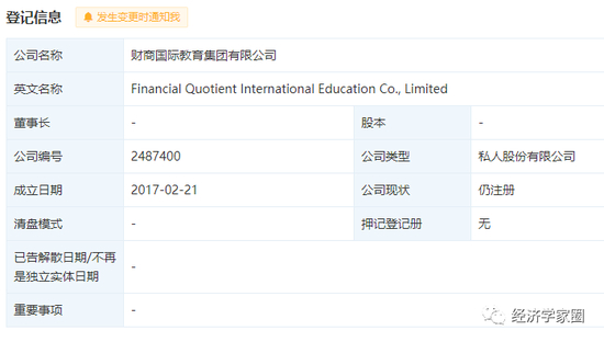 实际上微淼商学院2017年就开始运作,此前的公司是“霍尔果斯财商信息科技有限公司”,股东是一家神秘的香港企业,名叫“财商国际教育集团有限公司”,自此再无更多信息,满满的套路感。