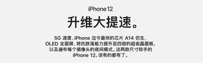 “5G”是 iPhone 12 系列最大的卖点。该产品发布前,苹果给出的邀请函写着“high,5G”;当你打开官网 iPhone 12 的主页面,映入眼帘的第一幕也是“5G”;iPhone 12 巨型户外广告,硕大的“5G”。