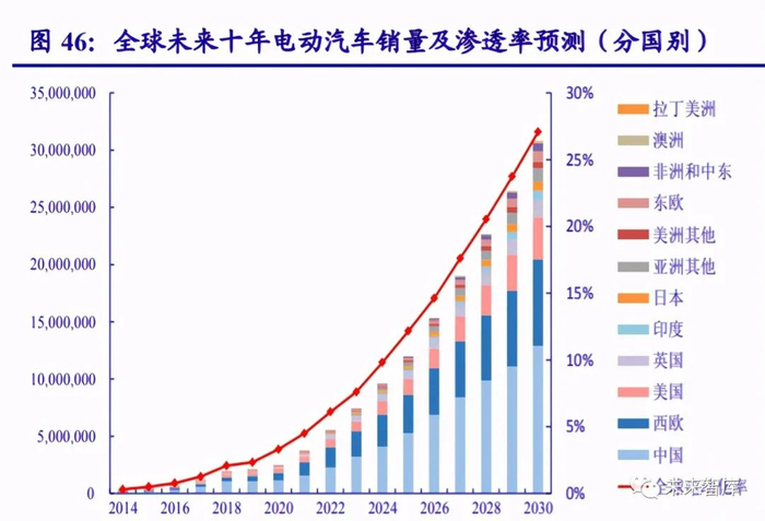 我们以“新能源车销量=全球汽车总销量*电动汽车渗透率”为基础,从国家、车企的两 个维度进行拆分,对未来十年的新能源车销量进行预测,并与各大机构的预测数据进行比较 研究。
