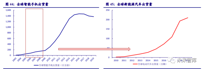 参考智能手机发展历程,2020 年的新能源汽车如同 2008 年智能手机,处于爆发前夜。2008 年 6 月,苹果发布 iPhone 3G,这是首款支持第三方应用的苹果手机,同年 10 月,HTC 公司 生产了第一台安卓手机“T-Mobile G1”。值得注意的是,当时的消费者仍在关注外观尺寸、触 摸屏、全键盘等问题,甚至许多主流科技媒体都没有意识到 Android 和 iOS 智能系统将在未来 带来革命性变革。直到 2010 年“再一次,改变一切”的 iPhone 4 发布,手机从通讯设备变成了 集通讯、娱乐、办公为一体的智能化信息终端,全球智能手机迎来爆发式增长。