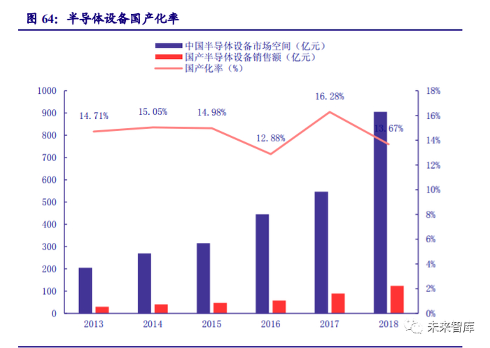 尽管国内半导体设备市场空间较大,但国产设备的占比仍较低。根据中国电子专用设备工 业协会的数据,2018 年国产半导体设备销售收入达到 123.8 亿元,国产自给率达 13.7%。由 于中国电子专用设备工业协会统计的数据包括集成电路、LED、面板、光伏等设备,实际上国 内集成电路设备的国内市场自给率仅有 5%左右,在全球市场仅占 1-2%,技术含量最高的集成电路前道设备市场自给率更低。