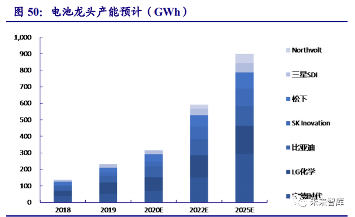 行业扩产大幕正徐徐拉开,预计设备市场空间将保持稳步增长。我们梳理了全球主要的 电池龙头——宁德时代、比亚迪、松下、LG 化学、三星 SDI、SKI 以及 Northvolt 的产能规划, 可以看到由于龙头的计划比较激进,预计到 2025 年产能合计将达 900GWh(不考虑报废)。