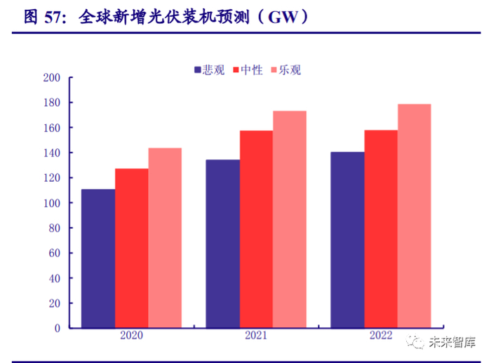 光伏产业仍处于快速成长期,市场驱动力将促进其未来五年的高速发展。在过去,光伏 产业的发展主要受益于政策的驱动力,来自政府的补贴为其发展提供了重要支撑。而自从 2018 年“531 新政”后,补贴力度被削弱,市场中企业降低了对补贴的依赖。在这一背景下,发电 成本降低这一内在经济性成为了助推需求增长的重要动力。目前,发电成本的大幅下降,“光 伏发电平价时代”已经开启,其相较于常规能源的竞争力即将显现。根据 NearZero 研究机构 的预测,光伏发电成本下降趋势将持续到 2025 年。基于低成本的核心市场竞争力能够保证光 伏行业的快速发展趋势更加稳定。在乐观估计下,全球新增光伏装机量能达到 178.7GW。