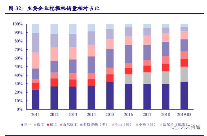 经过行业低迷期的洗牌,工程机械行业市场集中程度已较高,国产品牌市占率有所提升, 整体盈利水平改善较为明显。从主要企业的挖掘机销量占比来看,三一、徐工、柳工和山东临 工等中国企业销量占比自 2014 年起稳步提升。在选择的 8 家挖掘机龙头企业中,中国企业的 销量从占比已达到六成以上,三一和徐工占据近 40%的挖掘机市场。三一挖机:据公司半年 报,上半年三一挖掘机共销售 4.3 万台,市占率达 25.5%,稳居国内第一,营收为 186.49 亿元, 同比增长 17.22%。徐工挖机:上半年铲运机械营收同比增加 30.91%,挖掘机市场占有率同比 增长 0.9%稳居国内市场前两强,市占率超过 18%。国产工程机械龙头份额相对稳定、同比上 升,盈利能力增强,我们预计未来也将持续保持龙头地位。