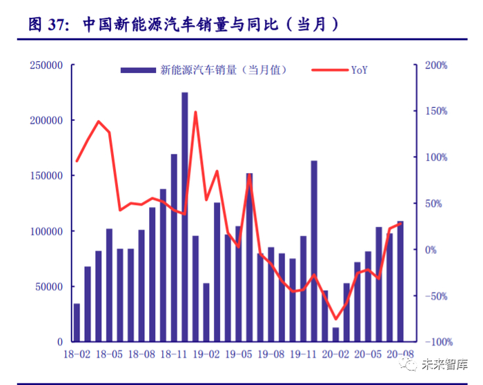 后疫情时代,新能源汽车销量迅速复苏。受补贴退坡影响,2019 年下半年国内新能源销 量增速下滑,2020 年初的疫情进一步冲击新能源汽车产销。而随着疫情的结束,新能源汽车 销量增速逐步上升,8 月销量达 10.9 万辆,同比增长 25.8%,已连续两个月保持正增长。受益 于需求端景气度提升,动力电池装机量于 6 月出现拐点,8 月装机总量达 5.11GWh,同比增长 40.31%。