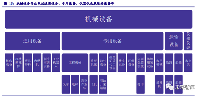 机械设备行业包括专用设备制造业、通用设备制造业、运输设备制造业、仪器仪表制造业 等。其中,专用设备包括工程机械、重型机械、冶金矿采化工设备、楼宇设备、环保设备、印 刷包装机械、纺织服装设备和农用机械等;通用设备包括机械基础件、机床工具、制冷空调设 备、磨具磨料和内燃机等,运输设备包括轨交设备、海工船舶设备等。