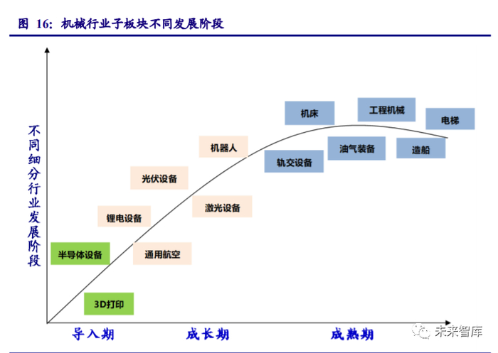 我国机械工业规模已居全球第一,但存在大而不强、自主创新能力薄弱、核心技术与关键 零部件对外依存度高、服务型制造发展滞后等问题。但机械行业子行业众多,不同子行业之间 差别较大,机床、造船、工程机械、油服装备、电梯等发展属于成熟期,其增长与宏观经济增 长高度相关,表现出较强的周期属性;而机器人、锂电设备、半导体设备等发展处于成长期, 国产替代、及下游需求对中游机械设备的驱动作用明显。