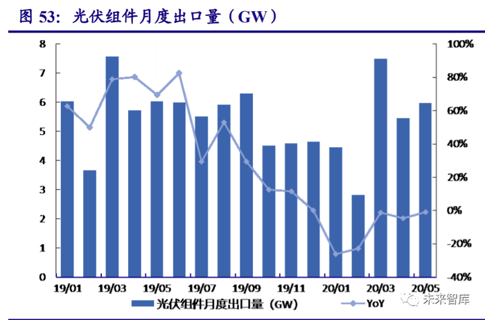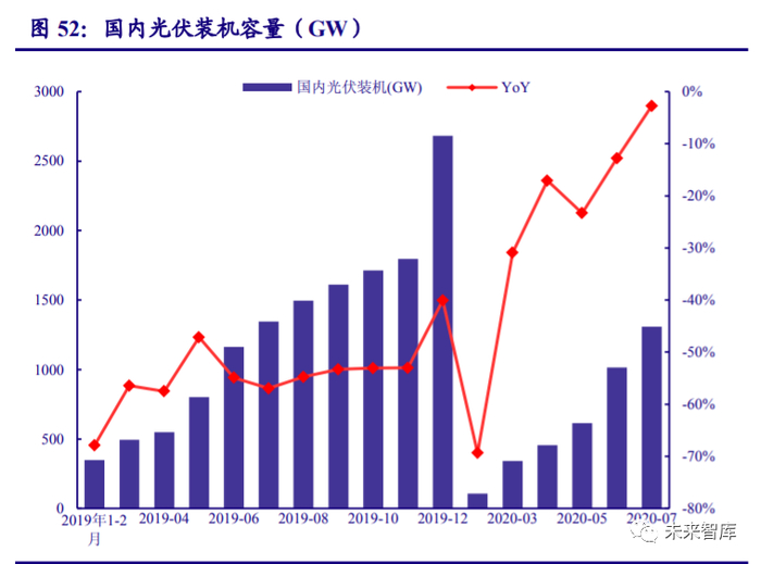 国内光伏装机快速复苏,看好下半年项目加速落地。伴随着疫情结束,国内光伏增速快 速回升,1-7 月国内光伏新增装机 13.01GW,同比下降 2.75%。根据全国新能源消纳中心公布的数据,2020 年新增光伏消纳能力高达 48.4GW。在消纳具有保障的前提下,光伏项目有望逐 步落地。根据初步的统计,考虑到 2019 年平价、竞价项目的延期结转,以及剩余的特高压、 领跑者项目建设完毕,预计全年装机仍有望实现 40-45GW,下半年项目加速落地。