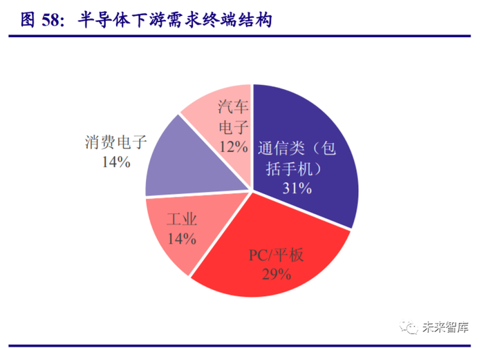 根据 SIA 数据,全球半导体下游终端需求主要以通信类(含智能手机)占比为 31%,PC/ 平板占比为 29%,消费电子占比 14%,汽车电子占比 12%。
