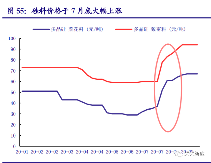 单晶硅料产能波动导致Q3 价格大幅上涨,并逐步向下游传导。7 月底由于西北硅料企业 的偶发事故,行业龙头的检修,以及新冠疫情期间的运输受限,硅料供应出现部分的短缺。在 国内光伏装机提速的背景下,供需短期失衡导致硅料价格出现大幅度上涨。随后,价格上涨的 压力逐步向下游传导,从而带来全产业链的上涨。