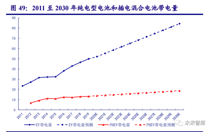 电动车带电量有望持续增长。且存在超预期的可能性。根据 IEA 的预测,全球电动车的 带电量将延续增长趋势,直至主流纯电动车续航里程达 350-400km。按照这个目标来进行测算, IEA 预计 2030 年纯电动车的带电量将达到 80KWh,插电混动达 15-20KWh。我们以往年数据 为基础,利用线性回归模型分析未来趋势,预测结果与 IEA 基本一致。但从目前趋势来看, 国内长安、广汽、BYD 等车企推出的纯电、插电带电量已超过这一目标,特斯拉发布的超级电池计划将有望使电动车续航突破 1,000km。因此,在电池龙头继续加大研发的背景下,我们 认为未来单车带电量可能超预期增长。