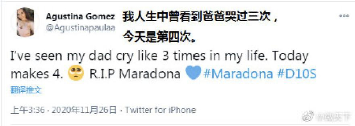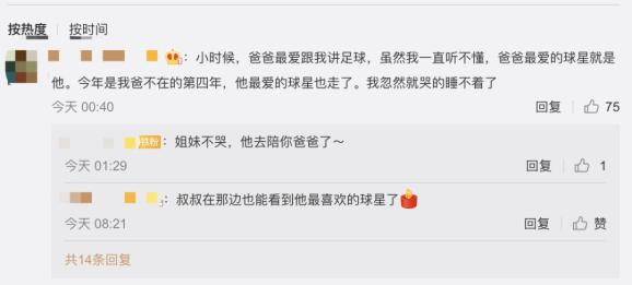 「小时候,爸爸最爱跟我讲足球,最喜欢的球星就是他,今年是爸爸不在的第四年,他最爱的球星也走了,我忽然就哭的睡不着。」