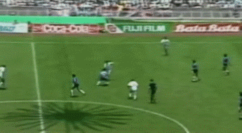 看到了1994年世界杯小组赛上,他面对4名防守球员的包围,左脚大力抽射将球打入死角后对着摄像机的怒吼。
