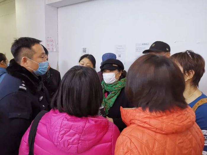 11月24日,警察(左一)在蛋壳公寓总部维持秩序,鼓励情绪激动的维权房东拨打12345市长热线反映问题。