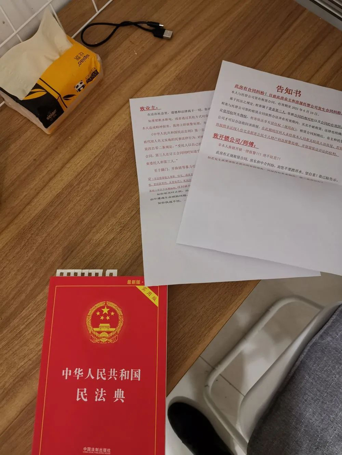 11月25日,王红玉客厅书桌上放着她的维权工具《民法典》和她写给房东的告知书。