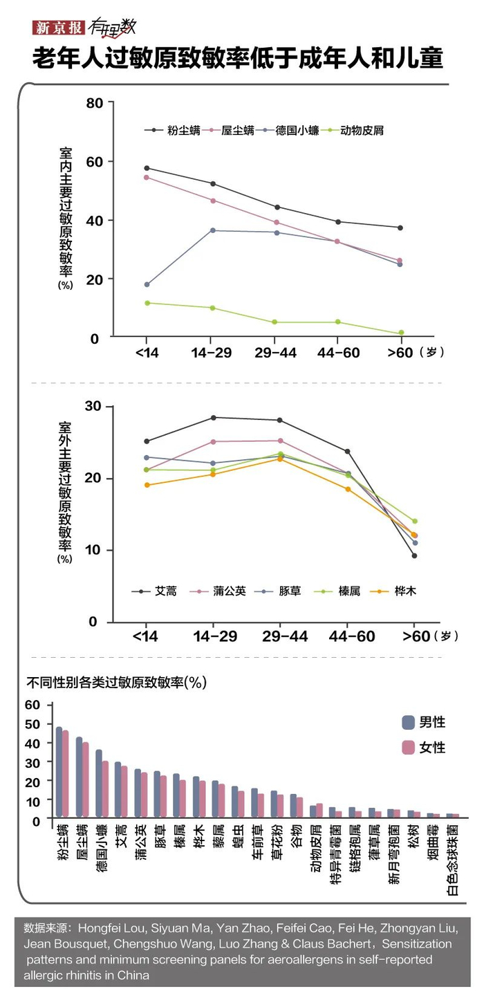 当然,不仅不同城市,男女之间、不同年龄的患病率也不尽相同,这在各类过敏原的致敏率上体现得尤为明显。