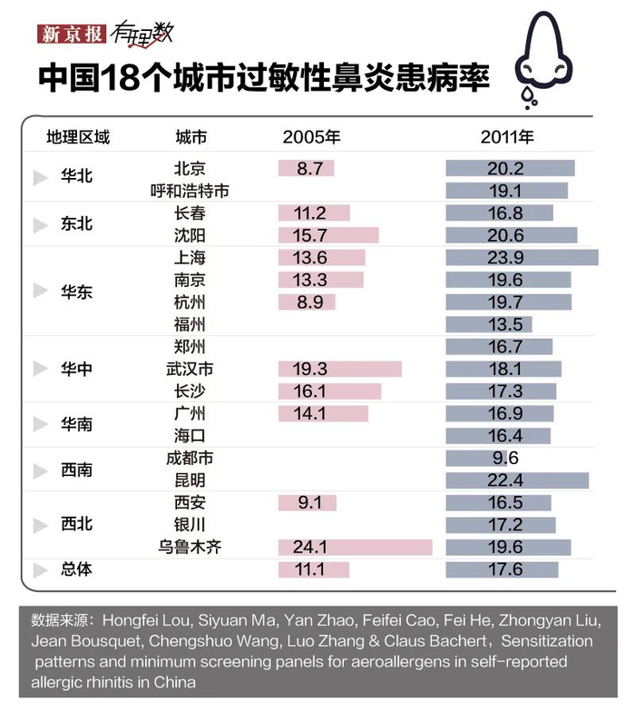 在中国,过敏性鼻炎患者也越来越多。2005年时,中国居民的过敏性鼻炎患病率在8.7%—24.1%之间,总体的患病率为11.1%。到了2011年,过敏性鼻炎的总体患病率已经上升到了17.6%,患病人数增加了1亿。