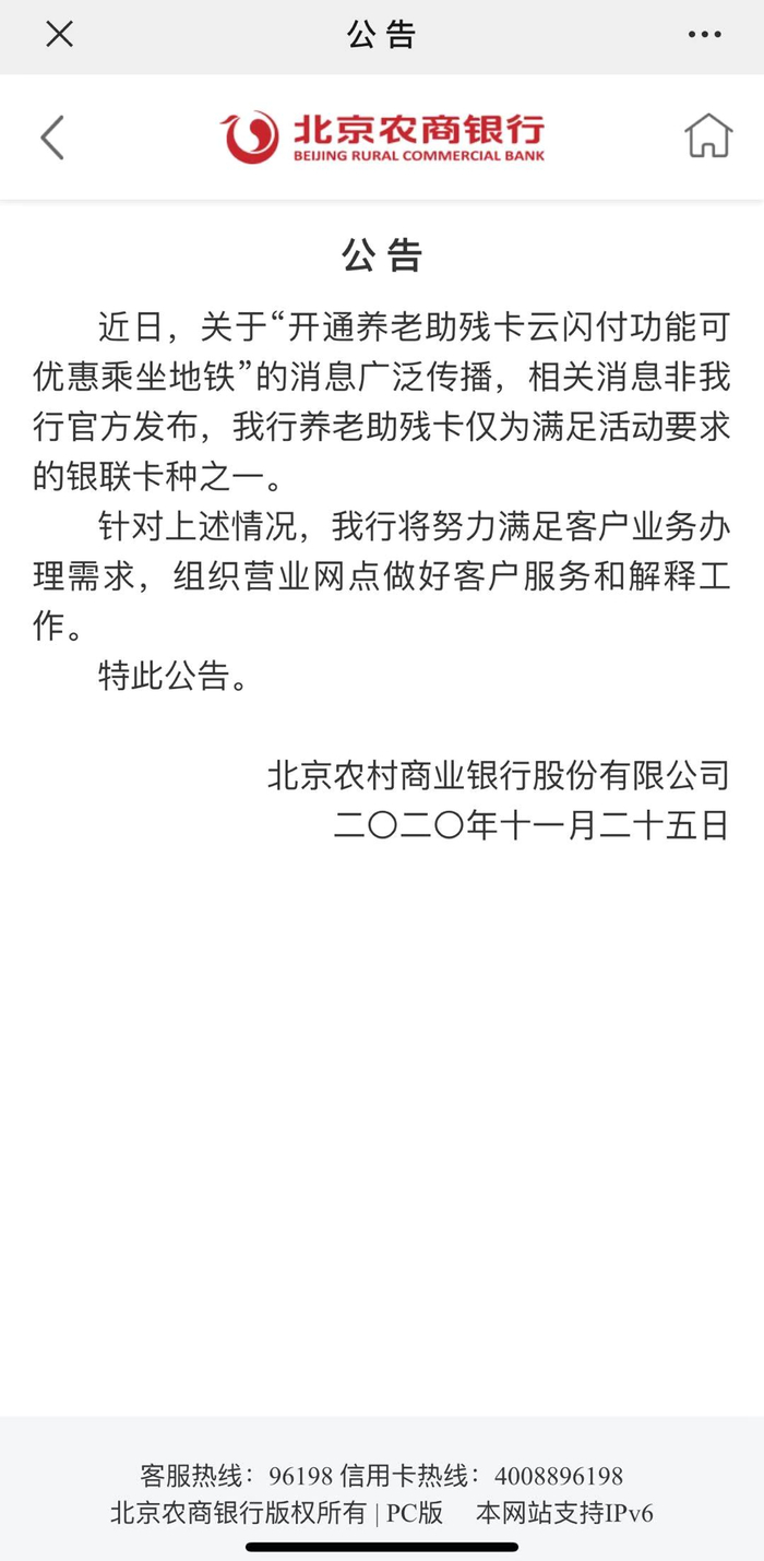 北京农商银行为此发布公告称:“近日,关于‘开通养老助残卡云闪付功能可优惠乘坐地铁’的消息广泛传播,相关消息非我行官方发布。”