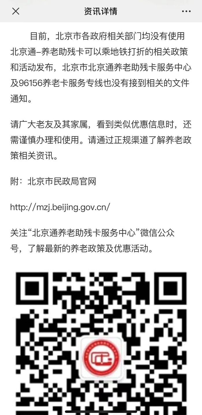 “北京通”养老助残卡服务中心针对此消息发布提醒说:“目前,北京市各政府相关部门均没有使用‘北京通’养老助残卡可以乘地铁打折的相关政策和活动发布,‘北京通’养老助残卡服务中心及96156养老卡服务专线也没有接到相关的文件通知。”