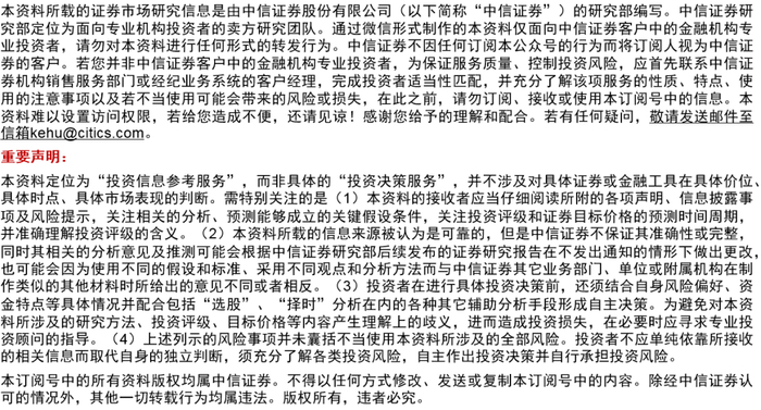 《中信证券一周研读》系对历史报告摘要的汇编,其内容均节选自中信证券研究部已经发布的研究报告,仅供汇总参考之用;《中信证券一周研读》不应被视为发布新的证券研究报告,或对节选的已外发研究报告的重新发布;若因对报告的节选而产生歧义的,则应以报告发布当日的完整内容为准。