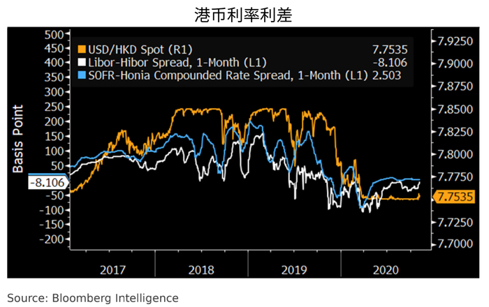 隔夜担保融资利率(SOFR)将在2021年取代Libor,因此SOFR将成为美元-港币利差计算中,美元端的唯⼀选择。不过,⽬前可能尚不清楚届时哪种本地利率最能反映⾹港的银⾏间流动性状况。交易员将⾯临两种选择:⼀是坚持使⽤Hibor,⼆是使⽤新的替代性参考利率--港币隔夜平均利率指数(Honia)。2021年以后,Hibor将与Honia并存,因此,银⾏并不急于降低对Hibor的依赖。