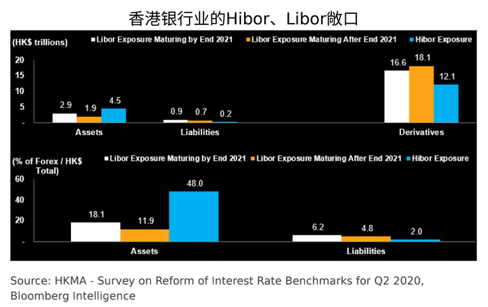 到2021年年底,Libor和其他主要银⾏间同业拆借利率将如期被取代,届时⾹港银⾏业可能会发现,Libor过渡较 Hibor更为迫切。根据⾹港⾦管局的数据,2021年后,Hibor将与Honia并⾏,但⾹港各银⾏可以灵活地保留基于 Hibor的资产和衍⽣品,其第1季度总额分别为4.5万亿港币和12.1万亿港币(名义价值)。