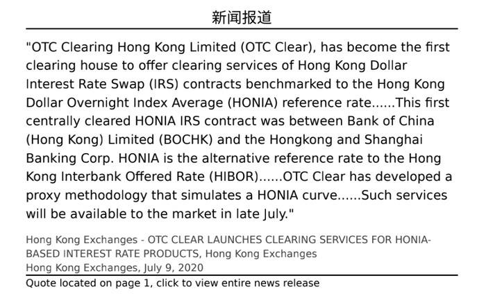 2019年3⽉,⾹港⾦管局⾸次提醒⾦融⾏业利率过渡的需要,但直到2020年7⽉初,港交所旗下的⾹港场外结算才开始提供以Honia为基准的港币利率掉期合约。⾸宗交易发⽣于汇丰银⾏和中银⾹港之间,我们认为,这是⼀笔具有象征性的交易。由于Honia本⾝并⽆期限结构,⾹港场外结算需要开发⼀个模拟Honia曲线的代理⽅法。在⾹港⾦管局决定彻底废除Hibor之前,Honia产品可能难以在⾹港扩⼤市场份额。(11/25/20)