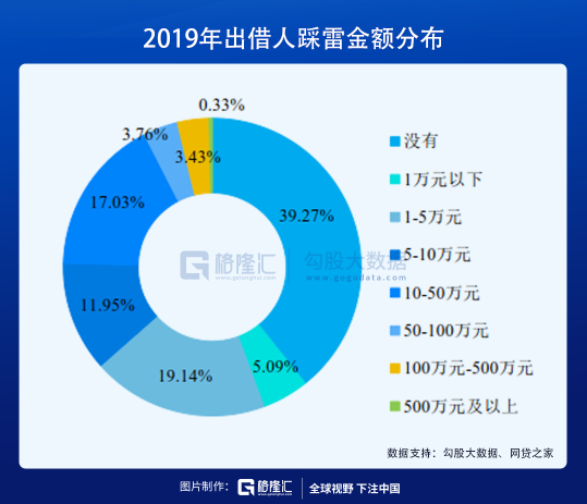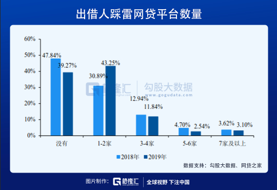 2019年,P2P行业退出平台高达732家。其中,网络出借人有60%以上的比例要踩雷。踩雷1-2家的平台出借人高达43%,踩雷3-4家的比例也高达11.8%。