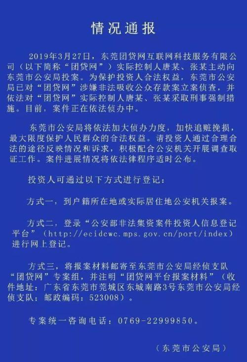 当年,知名大平台也陆续爆雷出事。2019年3月28日,东莞市公安局官方通报,团贷网实控人唐军、张林投案自首,警方以涉嫌非法吸收公众存款立案侦查。