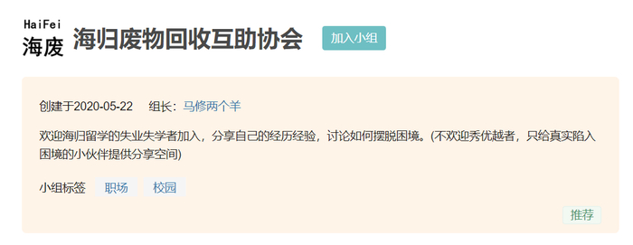 在这个小组中,吴英俊和留学生们管自己叫“Five”(谐音“废物”),用自嘲的形式来对冲面对升学、就业时的巨大压力。她觉得,像她一样的普通人在留学生群体中是大多数,当海归越来越多、竞争越来越激烈,“你不如人的时候,只能用一种自嘲的方式来化解这种焦虑”。