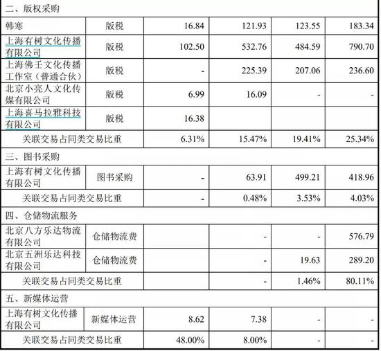 除了股权,果麦文化和韩寒及其控制的上海有树文化传播有限公司(简称“有树文化”)还有许多关联交易。