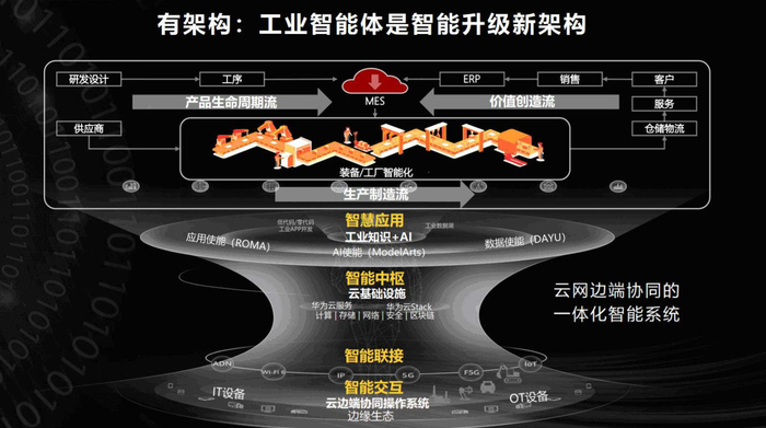 华为基于长期实践经验成果,认为工业智能体是制造型企业智能转型升级的最合理的技术架构。在史耀宏看来,架构升级是“工业智能体”的重中之重。通过智能应用、智能中枢、智能联接与智能交互四层级,可以构建“端、边、管、云”协同的一体化智能系统。而5G、云、人工智能等新技术的应用,也成为了工业企业智能升级的“新引擎”,让产品生命周期,价值创造流和生产工艺流走向智能化重构。