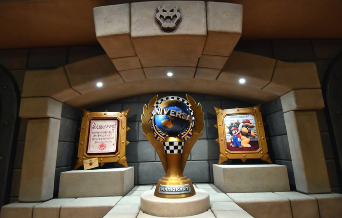 新展馆中除了展示玩家们将来乘坐的马里奥赛车外,超巨大库巴雕像同样吸引眼球,官方还为玩家准备了多种奖杯,现实中取得好成绩也可以拿到游戏中熟悉的各种奖杯实体版哦。