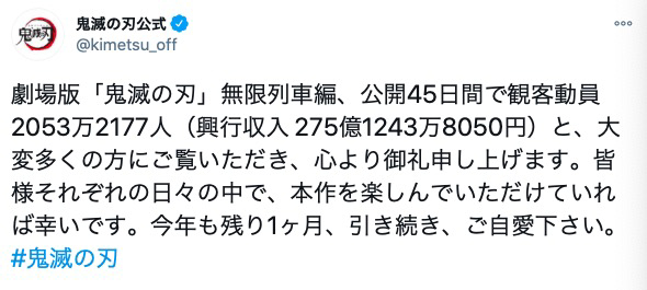 于10月16日公映的“鬼灭”剧场版《无限列车》以迅雷之势成为了日本“社会现象”级别的作品。上映后的首个周末票房就实现了历史最佳的46亿日元。仅10天后,这一数字就又轻松突破了100亿日元。《千与千寻》“破百”的天数为25天,而该片2001年上映后以308亿日元(约19.5亿元人民币)的纪录保持着日本影史票房冠军地位。