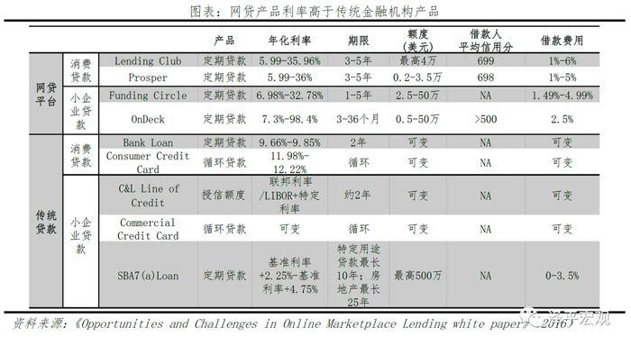 美国网贷主要是较为优质的无抵押消费贷款,其次是小企业贷款和学生贷款,作为针对高风险的小众市场,其目前成交量规模在百亿美元级别,市占率不高。以消费贷款市场为例,美国财政部2016年P2P白皮书显示,消费贷款市场规模达3.5万亿元,其中网贷平台贡献不足1%。此外,从产品设置看,其上线产品与传统金融机构产品相似,但明显利率更高。
