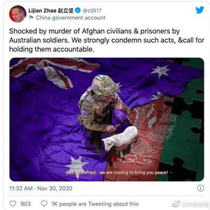 莫里森在新闻发布会上说:“这完全是令人发指的,在任何基础上都是站不住脚的……中国政府应该为这一帖子的发布而感到耻辱,这贬低了在世人眼中的他们的形象。”他还称,世界各国都在关注北京如何应对澳大利亚与中国关系中的紧张局势。
