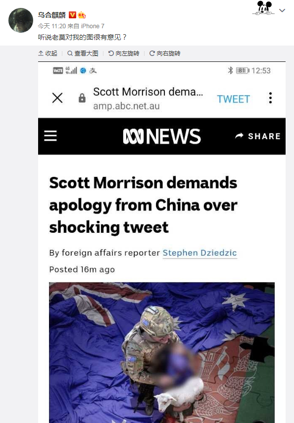 当地时间29日,澳大利亚总理莫里森突然要求中方道歉,起因是中国外交部发言人赵立坚日前敦促澳大利亚对最近的战争罪指控进行调查,并在推文中引用了中国漫画家@乌合麒麟的讽刺漫画。漫画中,一名澳大利亚士兵用刀抵着一名儿童的喉咙,上面还配有文字“不要害怕,我们来给你们带来和平”。而莫里森宣称,这幅漫画是“伪造的”,中国政府应该“感到耻辱”。