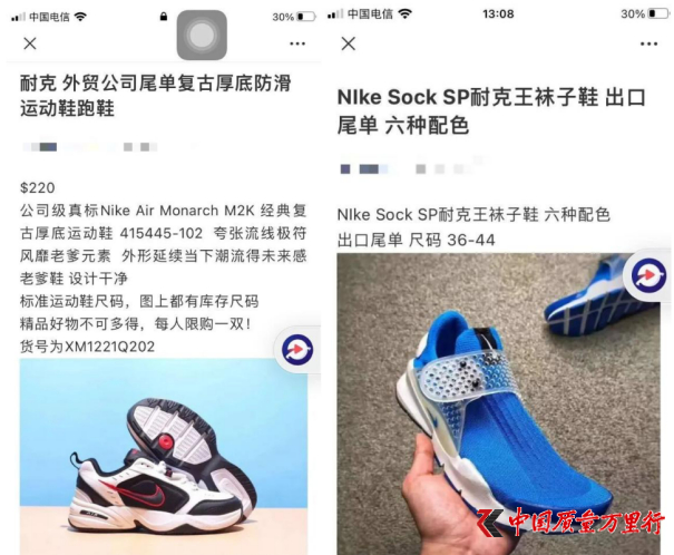 耐克尾单、断码清仓,或许你的微信群里就有这样的信息。近日,警方从微商的一条朋友圈开始。经采买鉴定,这些所谓的尾单货是纯粹的假货。