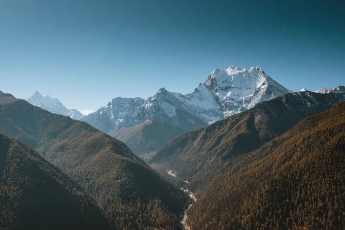 在这段距离中,由于海拔的急剧升高,气温也随之下降。在降水丰沛的贡嘎山区,厚重的积雪被挤压成晶莹冰川,贡嘎主峰周围的冰川多达74条,呈羽毛状向下扩散,像为“蜀山之王”披上了一层洁白的纱衣。