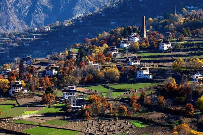 在丹巴,甲居藏寨的楼房沿着大金河谷层层而上,依托着山势绵延起伏,一直延伸至卡帕马群峰脚下,如同一幅汇集了雪山、河谷、溪流、人家的水墨画卷。