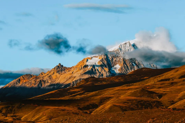 6500万年前,印度板块和亚欧板块碰撞,青藏高原开始逐渐隆起。而在青藏高原和四川盆地的交界之处,巨大的压力将高原东部挤压、紧缩,一系列落差极大的高山强势崛起,如同“大地的褶皱”,其中最引人瞩目的一座,即是今天甘孜州境内的