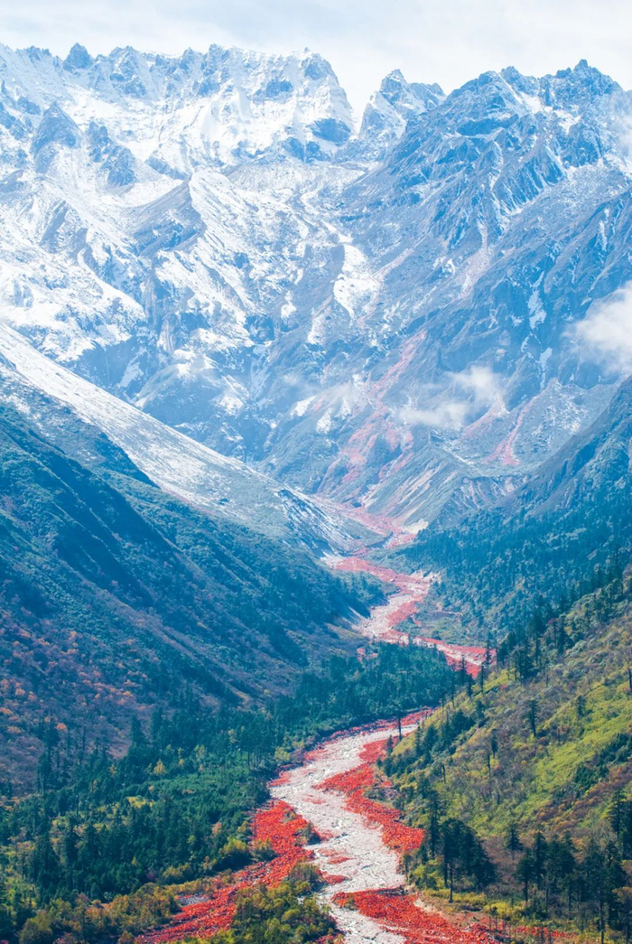▲ 海螺沟红石滩景观,冰川和雪山层次分明。摄影/罗斌