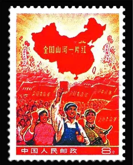 1968年11月25日中国邮政发行了“全国山河一片红”邮票,面值8分。2012年中国嘉德春拍,1枚“一片红”就以730.25万元的天价成交,创中国单枚邮票成交最高纪录。
