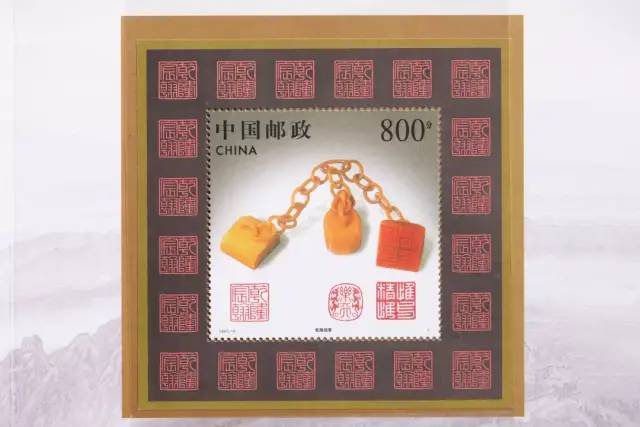 下面这张寿山石雕邮票中的“乾隆链章”是故宫博物院内所藏、溥仪捐献的带链田黄石印章(乾隆遗物),被视为“宫中瑰宝”,难得一见。