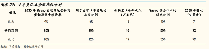自动驾驶赛道具体场景较多,需要专业化运营,根据我们对Waymo现已披露信息的理解,我们假设Waymo将精细化运营现有业务以占据尽可能大的市场份额,而非通过扩展不同场景来实现营收增长,因此以下营收预测均基于现有业务。