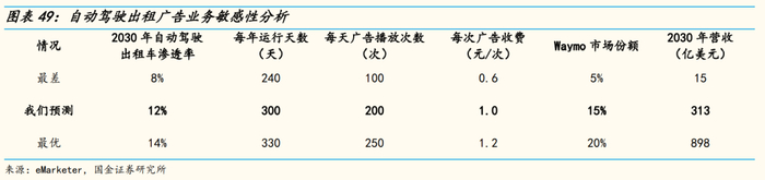 我们假设每年运行300天,每天播放200次;2030年Waymo自动驾驶出租市场份额达15%,定价为1元/次、15秒/次;取人民币美元汇率=7。
